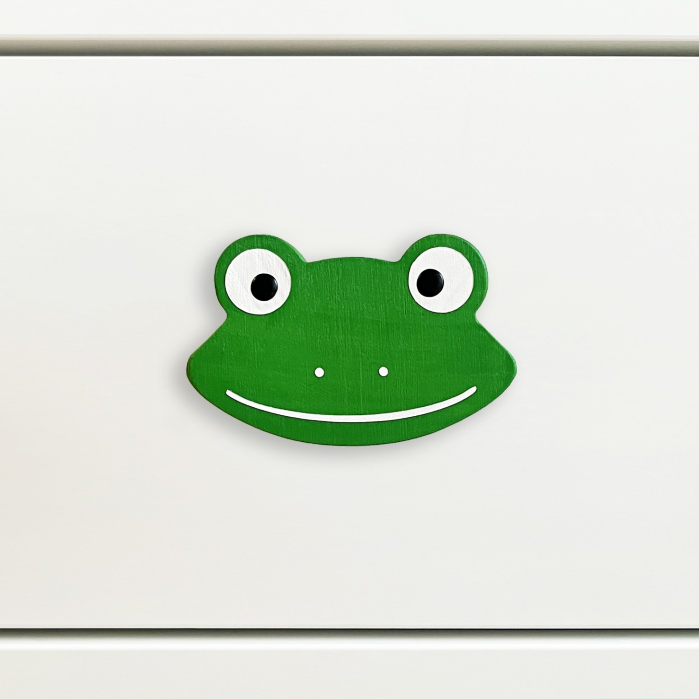 Kto tu zerka szeroko otwartymi oczkami i uśmiecha się od ucha do ucha? To Żabka – wesoła mieszkanka leśnych stawów, która uwielbia pluskać się w wyobraźni i pilnować dziecięcych skarbów w szufladach i szafkach! Teraz może zamieszkać w pokoju Twojego malucha i sprawić, że codzienne otwieranie mebli stanie się prawdziwą frajdą.